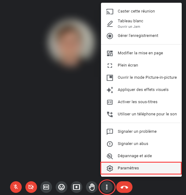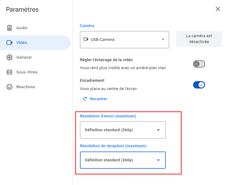 Vous pouvez également, si vous n’utilisez pas seulement l’audio de Google Meet, réduire le flux vidéo dans les paramètres.