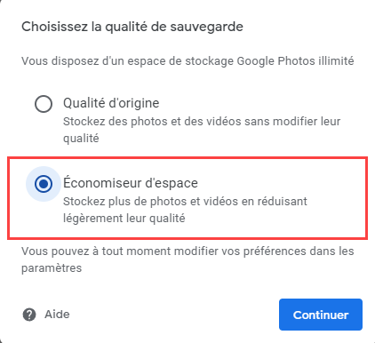 Vous pouvez choisir l’option “Économiseur d’espace” pour permettre de stocker plus de photos ainsi que de réduire l’impact environnemental lié à celles-ci. En contrepartie, la qualité de vos photos sera légèrement réduite.