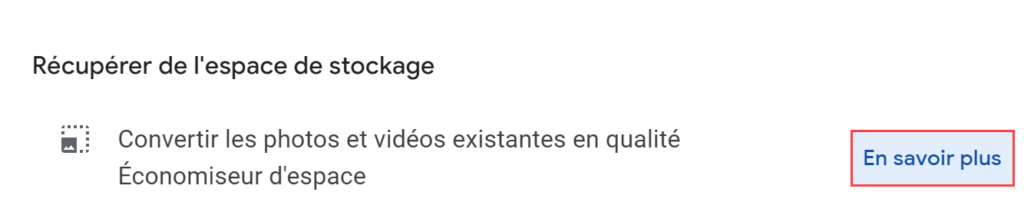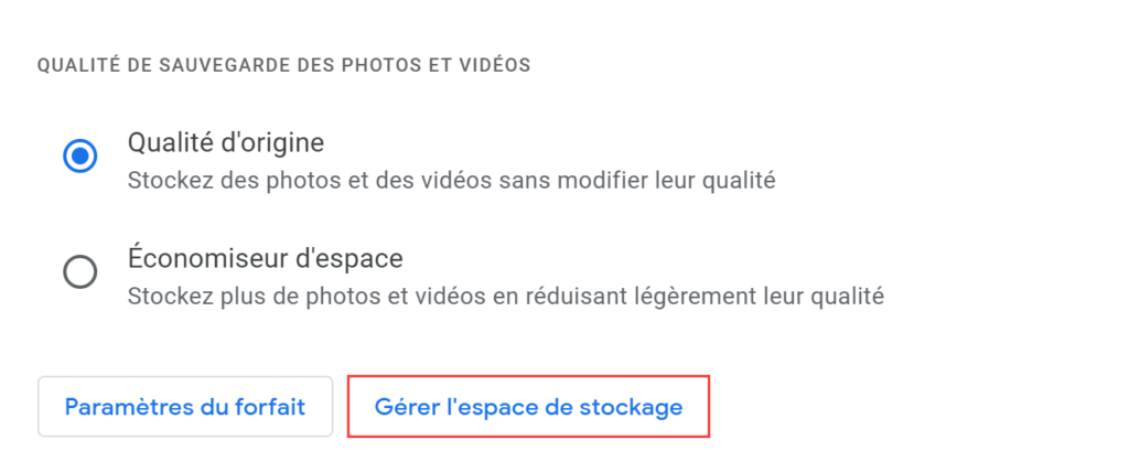 Allez dans les paramètres de Google Photos puis cliquez sur “Gérer l’espace de stockage” :