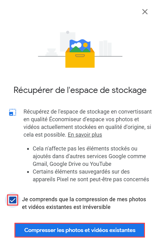 Cochez la case et cliquez sur “Compresser les photos et vidéos existantes”.